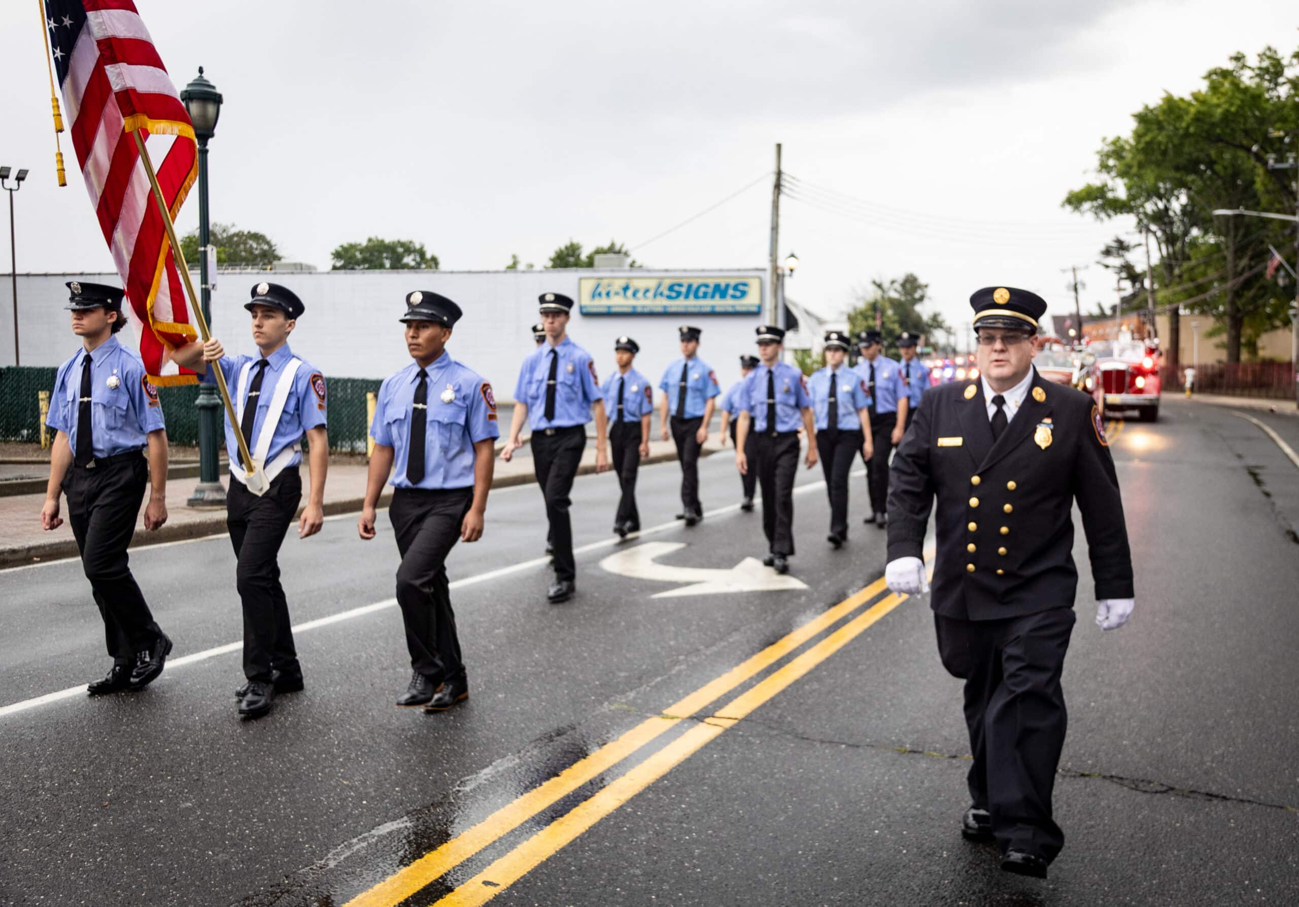 As the rain fell, the 6th Battalion fire departments and other neighboring departments proudly marched up East Meadow Avenue, much to the delight of a few hundred spectators who braved the weather along the parade route.