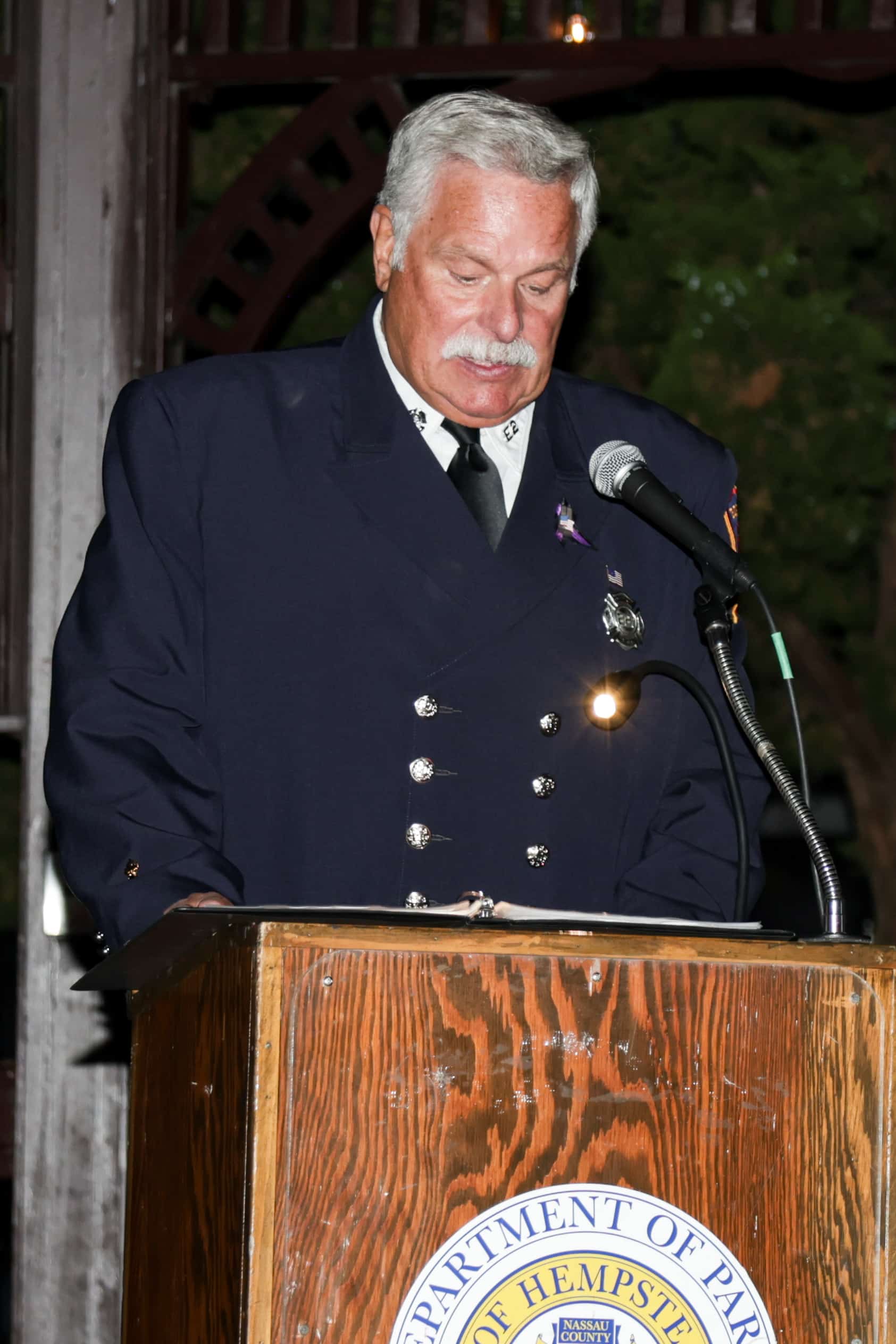 East Meadows own, Ex Chief Robert V. Hughes of the Nassau County Firefighter’s Pipes and Drum band played a fitting tribute of “Amazing Grace”. Soon after, the community sang together as one to the sounds of “God Bless America”.